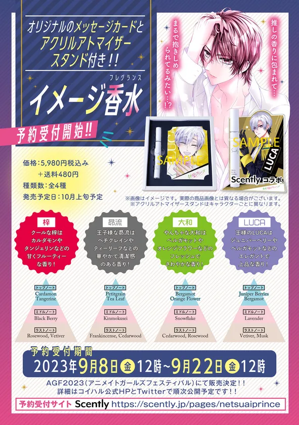 「熱愛プリンス お兄ちゃんはキミが好き」×「推し香水サービスScently(セントリー)」コラボ!!梓・昴流・LUCA・大和の4種類!