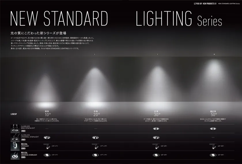 同シリーズは、「ユニバーサルダウンライト」と「スポットライト」があり、両機種とも同質の配光が得られ違和感のない照明設計が可能です。配光角の狭角・中角・広角・超広角、それぞれに明確な差を設け、より使いやすく、わかりやすい器具選定が行えるようになりました。