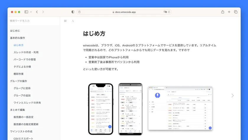 winecodeは業務用であることから機能が多く、以前から利用していただいてるユーザ様にも「隠し機能が多い」「使いこなせているかわからない」と声をいただいていたので、公式ドキュメントを整備しました。