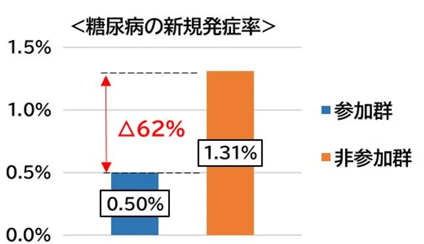 初年度にYWPに参加し、かつ参加後の平均歩数が10,000歩/日以上の群と、YWPに参加しなかった群を5年間追跡し、結果に影響を及ぼす可能性のある背景要因(年齢、性別など)を揃えて分析したところ、参加群の糖尿病新規発症率は0.50%だったのに対し、非参加群は1.31%であり、参加群の方が0.81ポイント低くなっていました。これは、参加群の発症率が非参加群に比べて62%低いことを意味します。