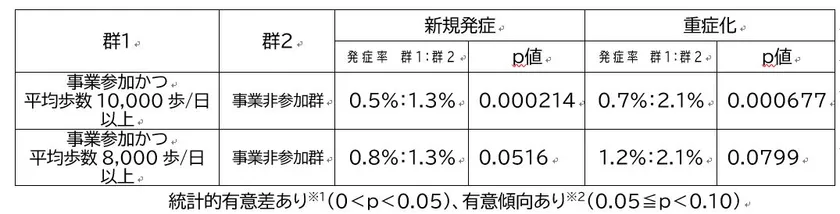 具体的な歩数については、事業参加群の1日当たりの平均歩数が8,000歩を超えるあたりから、非参加群との間の発症率・重症化率の差に有意な傾向が見られました。また、日本国民の平均歩数が男性6,793歩、女性5,832歩(※3)であることを考えると、当初の歩数よりも1,000~2,000歩多く歩くと、より効果的だと考えられます。