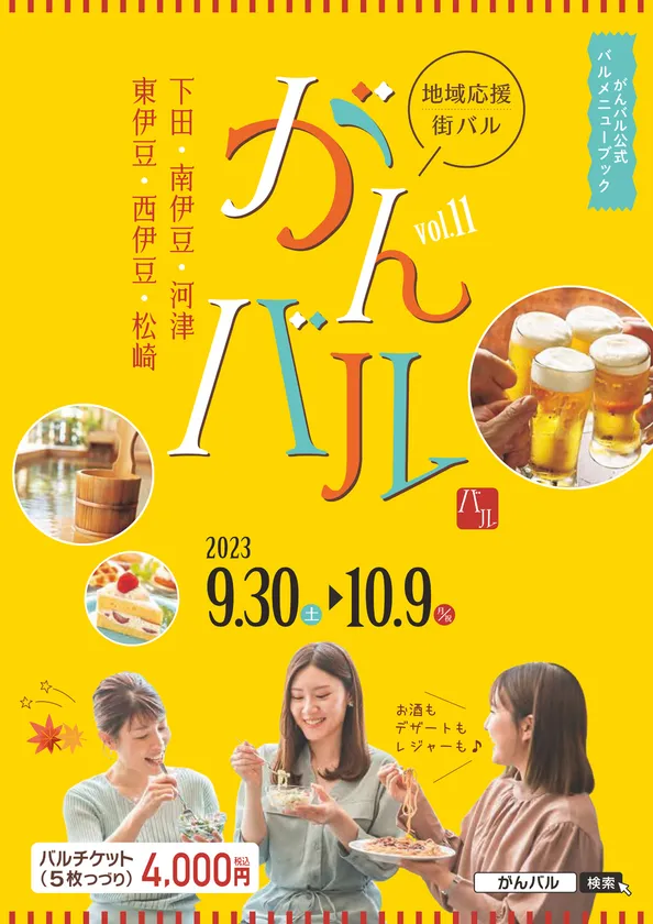 一綴りのチケットで、遊んで食べて温泉に浸かって一杯飲んで、お土産まで買える、伊豆バルイベント「がんバル」のチケット(4,000円分)を参加者全員にプレゼント!事前に郵送にてお送りいたしますので、期間中いつでもご自由にお使いいただけます。