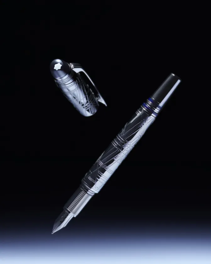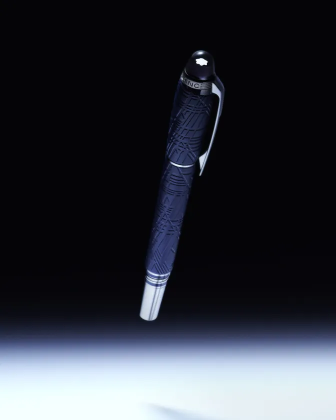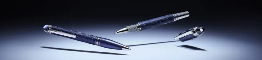 スターウォーカー スペースブルー コレクションは、3つのエディションで展開します。星空を思わせる深みのあるスペースブルーのマットプレシャスレジンに、ダークルテニウム仕上げを施したメタルパーツを組み合わせたレジン、プレシャスレジンの軸にメタルキャップを組み合わせたドゥエ、そして全体に模様を施したメタルです。それぞれのエディションはボールペン、ファインライナー、万年筆の3種類で、ペン先にはルテニウムコーティングのAu 585を使用し、スターウォーカー コレクションのために特別に設計されたピストン・コンバーターが装着されています。