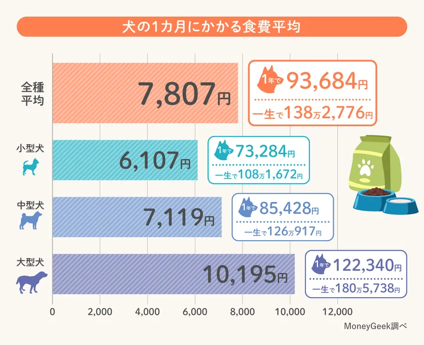 調査の結果、犬の食費の月平均は全種平均で7,807円でした。