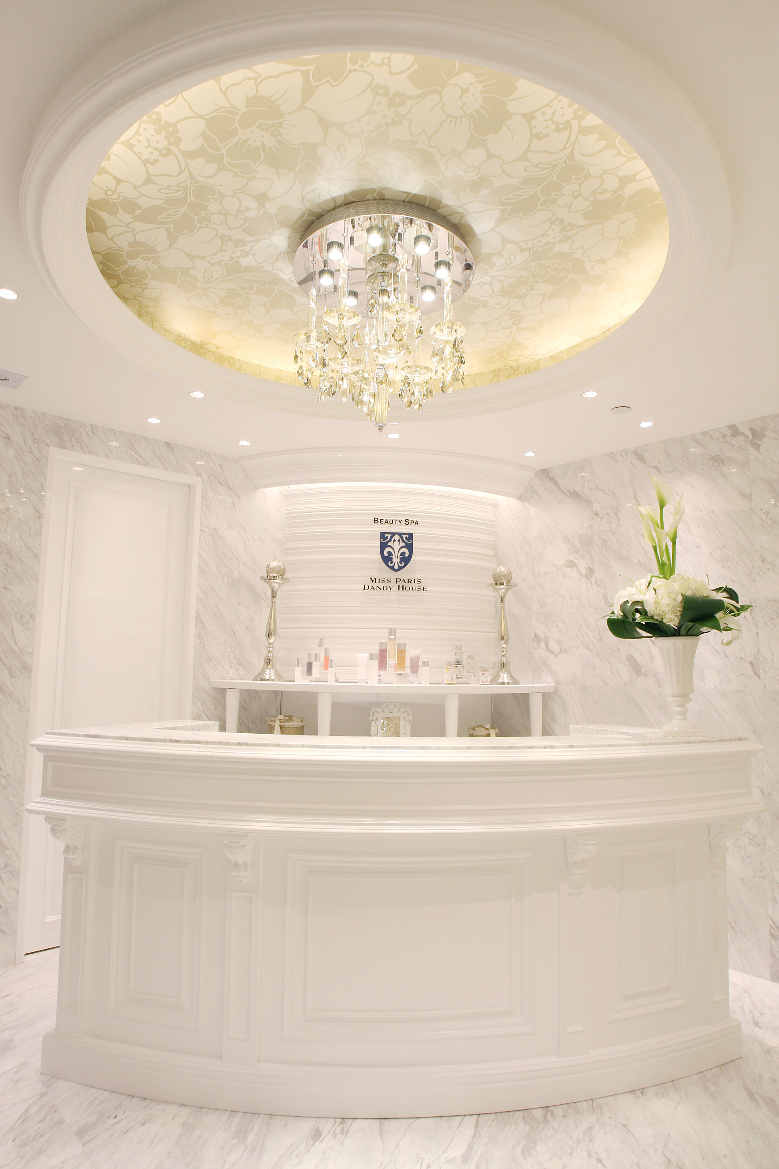 床や壁に天然の大理石を使用し、透明感溢れるシャンデリアが気品漂う空間を演出。本物にしか出せない美しさを堪能できます。また、全室デザインの異なる個室を完備しお客様に安らぎを与え優雅なひと時を過ごしていただけるサロンに仕上がっています。女性専用の「エステティック ミス・パリ」も併設しているので、男性だけでなく、ご夫婦やカップルでもご利用いただけます。