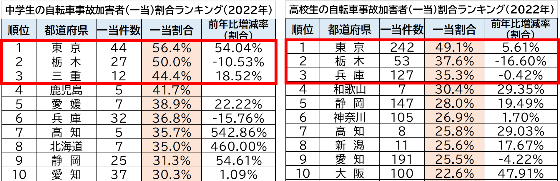 自転車の安全利用促進委員会は、9月21日から始まる「秋の全国交通安全運動」にあわせ、2022年の全国都道府県別、中学生・高校生の通学時における自転車事故発生件数について調査・分析しました。本調査では、公益財団法人交通事故総合分析センター(ITARDA)から提供を受けた2022年(1月~12月)の事故データを、当委員会メンバーの古倉宗治(一般社団法人日本シェアサイクル協会 会長/NPO法人自転車政策・計画推進機構 理事長)監修により調査・分析を行いました。