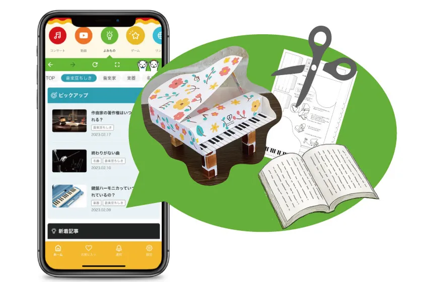 新設の「ピティナ」タブでは、ピティナが持つ、お子さまが自宅で遊べる工作コンテンツや、保護者に向けた音楽や教育に関する情報を公開していきます。