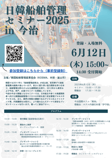 日韓船舶管理セミナー2025、6月12日(木)15:00~ @今治国際ホテル