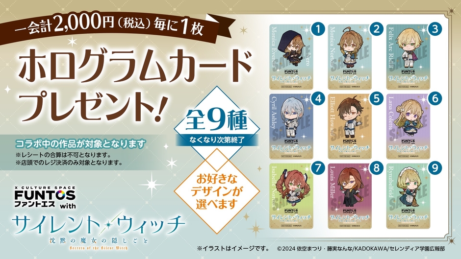 カフェ・グッズコーナーにて一会計2,000円(税込)毎に1枚、お好きなデザインのホログラムカード(全9種)を1枚プレゼントいたします。