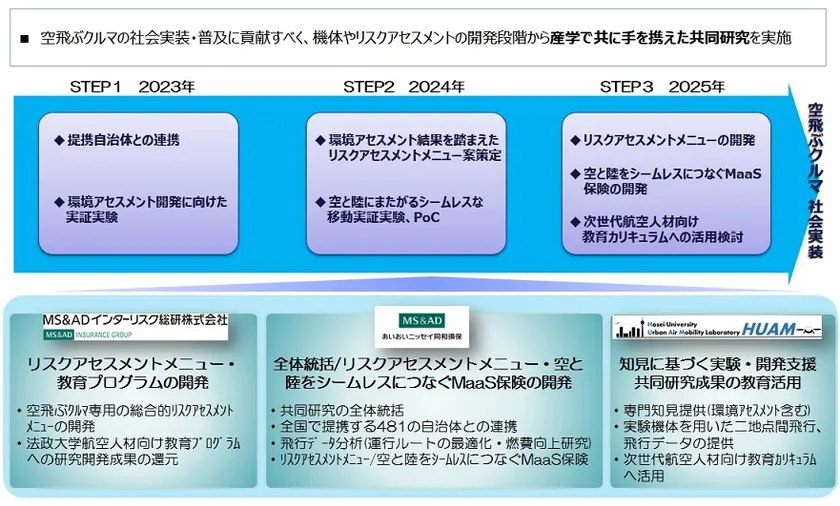 HUAM及びあいおいニッセイ同和損保とMS&ADインターリスク総研の3者は、本共同研究を通じ、空飛ぶクルマを活用した新たな産業の創造や社会課題解決に貢献していきます。
