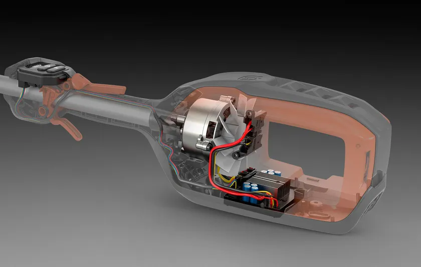ハスクバーナ開発の後方に配置されたE-TORQ モーターは、ブラシレス設計で可動部品の数を最小限に抑え、モーターは長時間の使用に耐えるように設計されています。