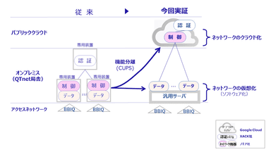 今回の技術実証では、QTnetのBBIQ光回線サービスのインフラ設備(固定通信網)へ第5世代移動通信網(5G)の主要技術である仮想化技術および機能分離技術(CUPS※)の適用について実証します。当社は、パブリッククラウド上の通信装置制御部と連携し、ユーザー認証を行うRADIUSサーバーを担当します。