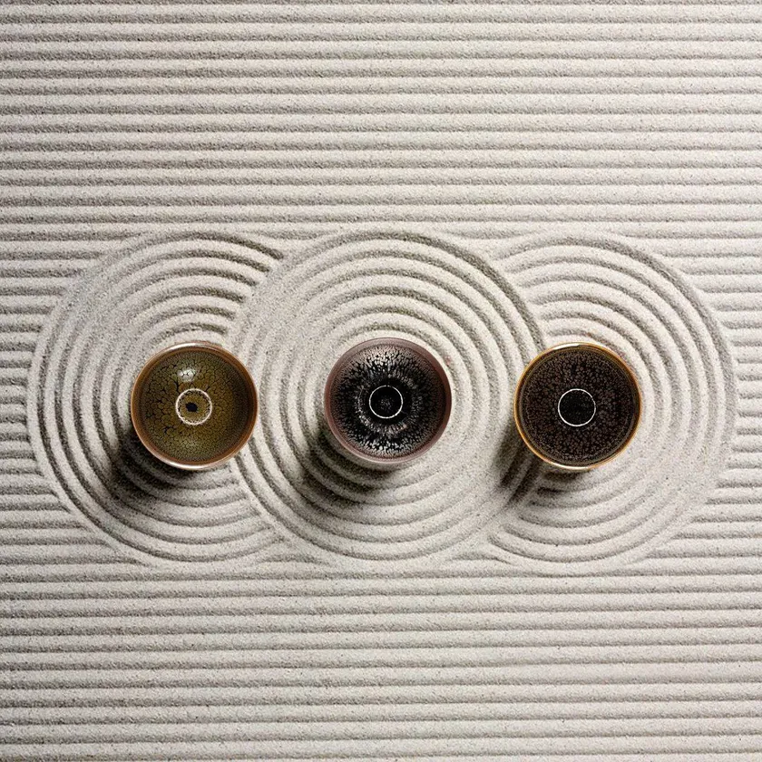 「天目茶碗」の歴史は、中国の建窯(福建省建陽県)で焼造された「建盞(けんさん)」と言われ、五代末期(10世紀中葉)、考古学的発掘調査では北宋(ほくそう)末期(12世紀初頭)頃が始まりとされています。「建盞」は日本でとくに珍重され、なかでも黒釉陶の至芸「曜変(ようへん)天目」が有名で、そのほかにも「油滴(ゆてき)天目」「禾目(のぎめ)天目」「灰被(はいかつぎ)天目」など多くの種類が存在します。
