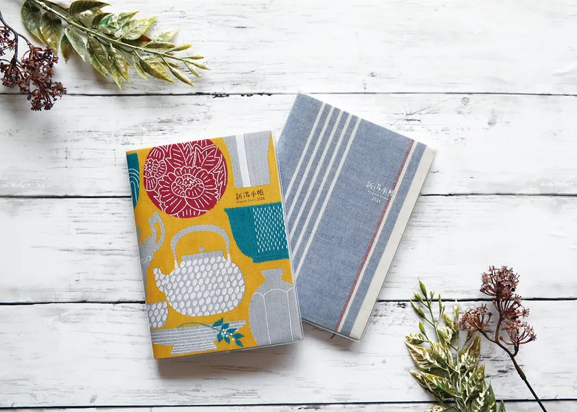 表紙は新潟の布絵作家ヤマヤアキコさんの布絵「うつわ」(上部写真左)と、300年もの歴史を持つ織物『亀田縞』(上部写真右)のリバーシブル。どちらも新潟手帳2024オリジナルデザインです。