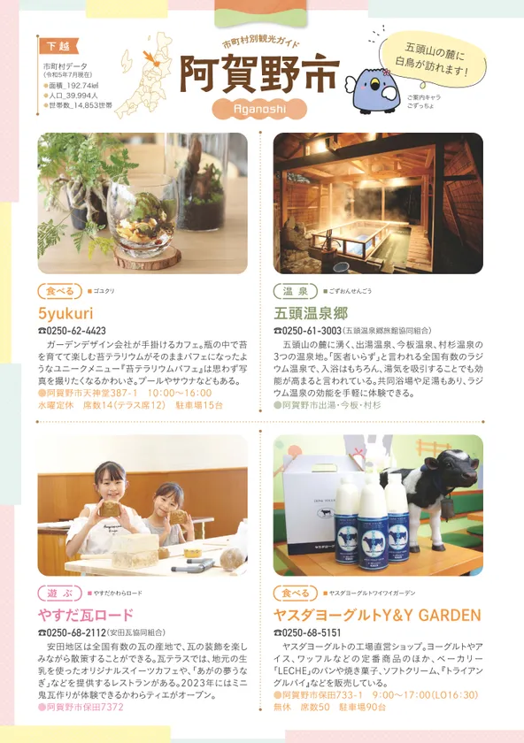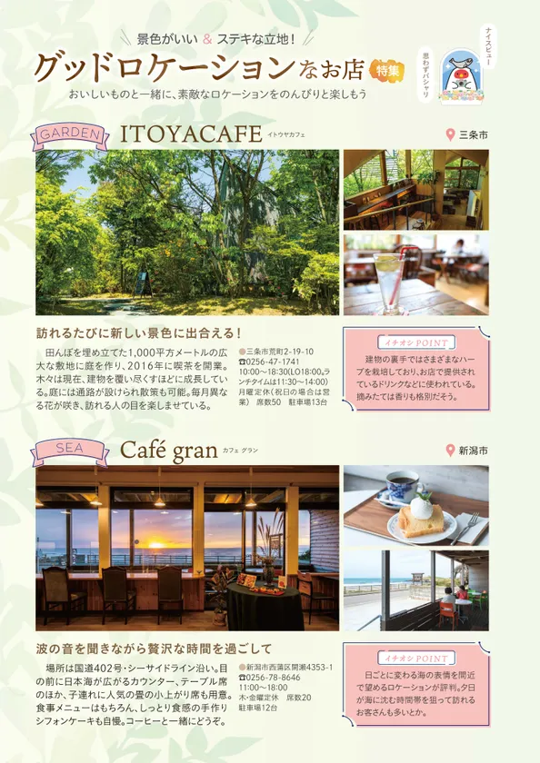 新潟で長年愛されるタウン誌「月刊にいがた」の編集者による特集ページも充実しています。「新潟の絶景」や「新潟の30市町村」、「グッドロケーションなお店」など、新潟での生活が楽しくなる特集をたっぷり掲載しています。