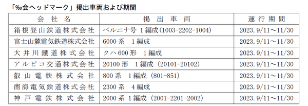 箱根登山鉄道株式会社、富士山麓電気鉄道株式会社、大井川鐵道株式会社、アルピコ交通株式会社、叡山電鉄株式会社、南海電気鉄道株式会社、神戸電鉄株式会社の7社による「全国登山鉄道‰(パーミル)会」では、2023年9月11日(月)から恒例の「‰会ヘッドマーク」掲出車両を各社で運行します。