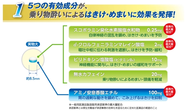 さらに、2層構造のダブルモーション錠とし、反射性のはきけと平衡感覚の乱れによるはきけ・めまいに効果的に働きます。乗り物酔いの予防にはもちろん、酔ってからの服用でも効果を発揮するので、長時間の乗り物移動や、テーマパークのライド系アトラクション、船釣りなど、乗り物酔いが心配だけど楽しみたいシーンにおすすめです。