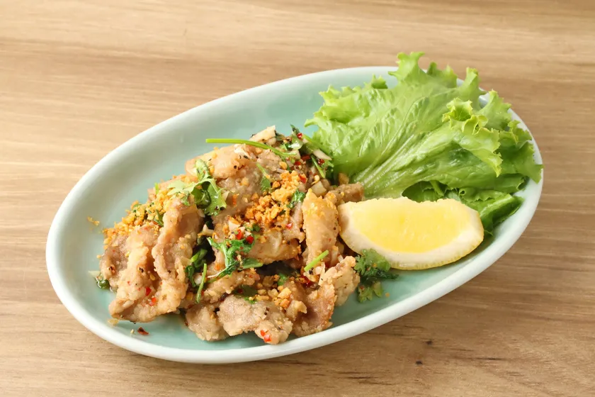 ムー・トード・ガティアム/豚肩ロースのニンニク黒コショウ炒め