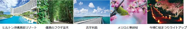 ・古宇利島、もとぶ八重岳桜まつり、備瀬のフクギ並木、万座毛、首里城公園など観光