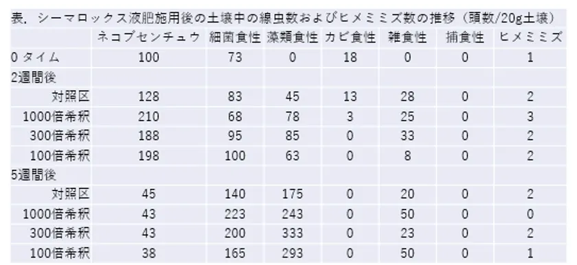 シーマロックス液肥を1,000倍希釈から100倍希釈し、土壌に混和し、5週間培養することで、土壌センチュウ群集に及ぼす影響を評価した。
