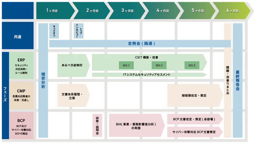 CSIRT強化ワークショップを実施し、現状分析やインシデント発生時に実働できるCSIRT及び、インシデント対応における要素を網羅した運用手順資料を整備します。