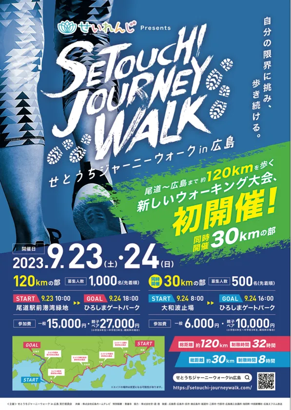 せとうちジャーニーウォーク実行委員会と株式会社広島ホームテレビが共催する、2023年9月23日(土)~24日(日)に尾道市~広島市の約120kmを歩くウルトラウォーキング大会が開催間近であることをお知らせします。