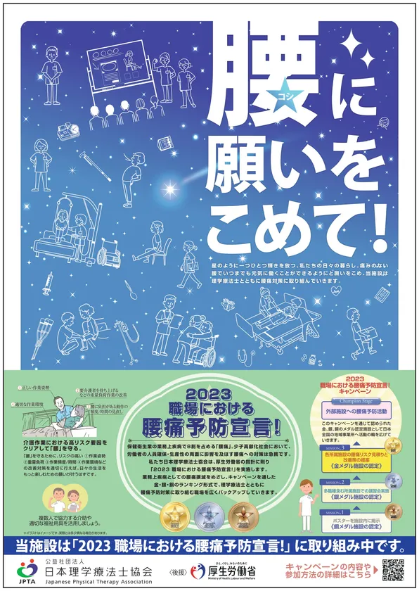 公益社団法人日本理学療法士協会(会長:斉藤 秀之)は、「2023 職場における腰痛予防宣言!」と題して、本会会員が自らの職場等で腰痛予防に取り組む事業を、厚生労働省のご後援のもと、2023年10月2日(月)から実施します。