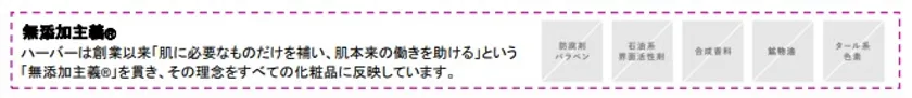 ハーバーは創業以来「肌に必要なものだけを補い、肌本来の働きを助ける」という「無添加主義(R)」を貫き、その理念をすべての化粧品に反映しています。
