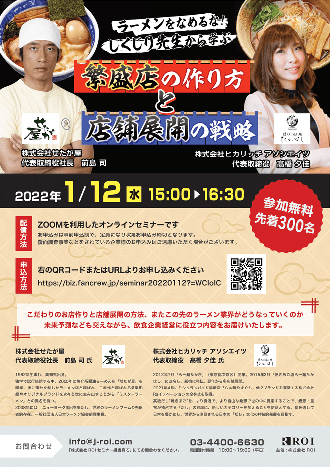 株式会社ヒカリッチアソシエイツ(本社:東京都中央区、代表取締役:高橋 夕佳)社長の高橋夕佳が、2022年1月12日(水)に株式会社ROI主催飲食応援セミナーに登壇いたします。当日は、「繁盛店の作り方と店舗展開の戦略」と題し、株式会社せたが屋の前島社長と共に、こだわりのお店作りと店舗展開の方法、またこの先のラーメン業界がどうなっていくのか、未来予測なども交えながら、飲食企業経営に役立つ内容をお届けいたします。