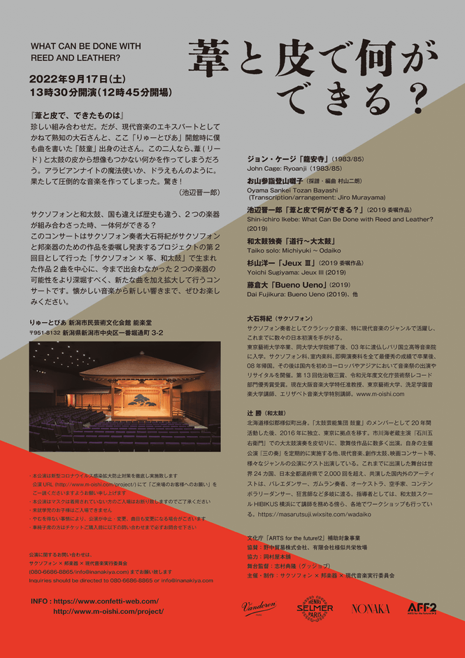 サクソフォン×邦楽器×現代音楽実行委員会主催、『葦と皮で何ができる?』が2022年9月17日 (土)にりゅーとぴあ 新潟市民芸術文化会館 能楽堂(新潟県新潟市中央区一番堀通町3-2)にて開催されます。