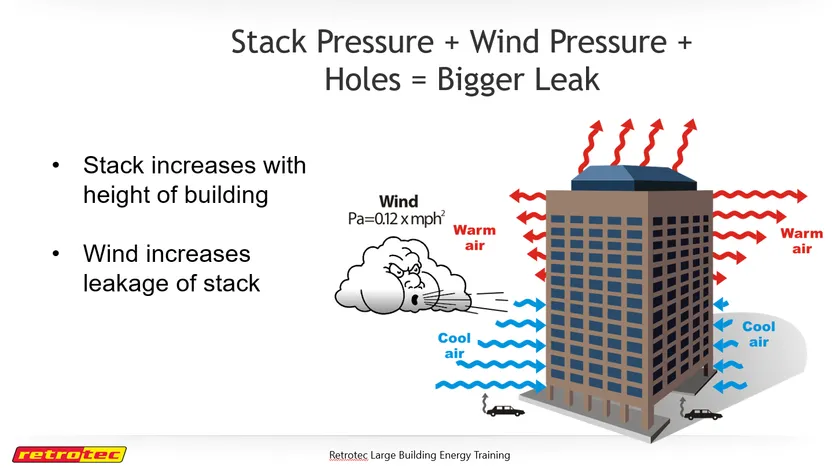 一般的に気密性能を向上させると、(1)エネルギーロスの削減、(2)室内快適性の向上、(3)汚染物質除去効率の向上、(4)壁内結露抑制による建物耐久性の向上、以上の4つの効果があるとされています。特に大型建築ほど都市部などの交通量の多い場所に計画されるため周辺の空気の清浄度も低い傾向にあり、気密性能が低いとフィルターを介さずにそうした排気ガス混じりの空気を室内に引き込むリスクが高まります。また大型建築においては、建物の高層化による煙突効果の増加と高層部の風速増大により、低層建築よりも室内外の差圧が大きくなり漏気量も増大する傾向にあるため、気密性能が低いことで生じるリスク(汚染空気の流入、壁内結露の発生など)がより高いといえ、建物の健全性や利用者の健康を守るためにも気密性能は重要になります。
