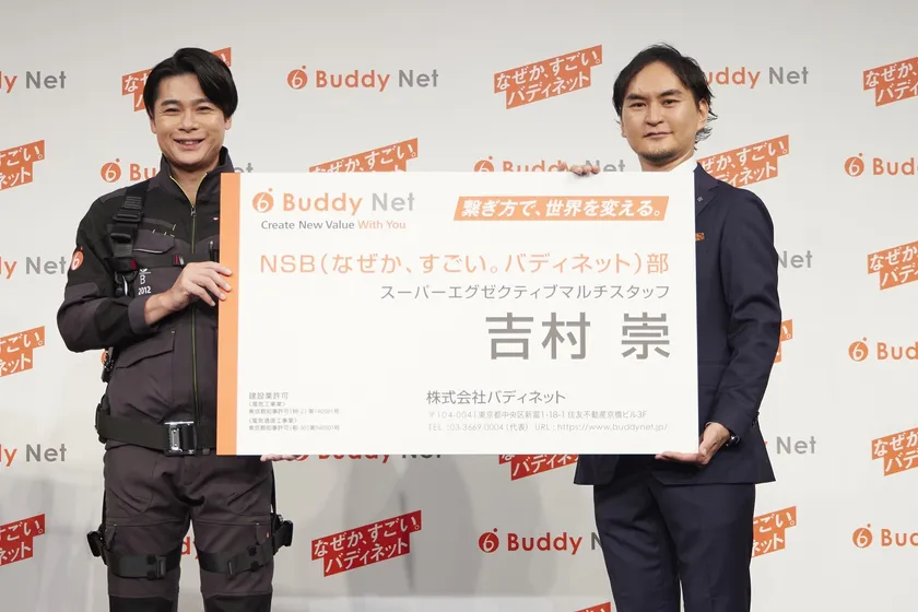 説明後、堀社長の呼び込みで、オレンジ色のスーツ姿のみちょぱさん、そして冒頭からMCとして登壇していた平成ノブシコブシ 吉村崇さんが登場しました。ここで堀社長より改めてお二人が当社の「NSB(なぜか、スゴイ、バディネット)部」に就任したことを発表し、そのお仕事として、吉村崇さんがMCを担当していたことや、お二人のYouTubeチャンネル「みちょぱ吉村のマブマブTV」とコラボしたYouTubeライブ配信でCMの企画会議( https://youtu.be/366LP3otrP0 )を行ったことについて触れ、そのダイジェスト映像の上映後、いよいよ新CM、「なぜか、すごい。バディネット。始動編」、「なぜか、すごい。バディネット。活動編」の2本が初公開されました。