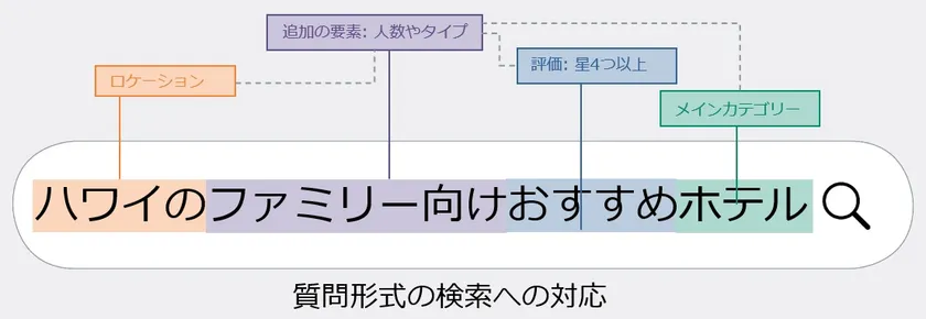 Webサイト訪問者が検索窓に入力されるキーワードを分解して内部クエリに落とし込みます。この際、自然言語解析により検索意図を理解しながら意味づけしていきます。