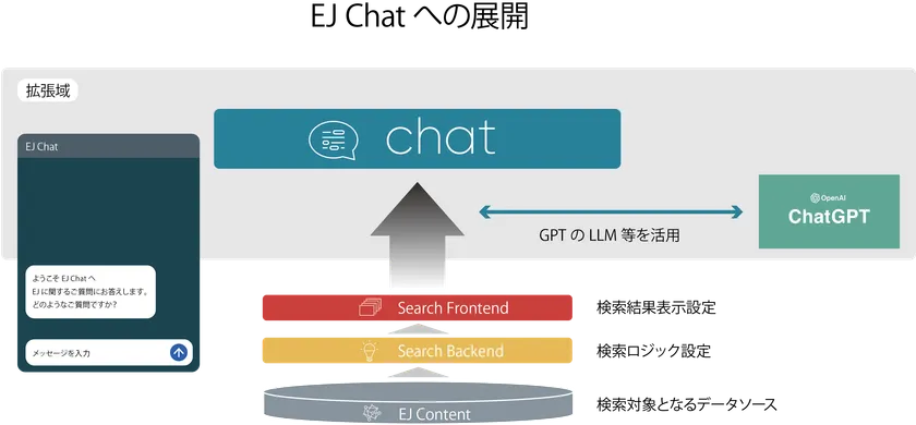 「Encourage Japan Search」がもつ自然言語解析を用いた検索サービスを使用し、検索意図を理解したクエリをバックエンドで生成、構造化されたデータに対し検索し、より精度の高い情報を迅速に返答します。