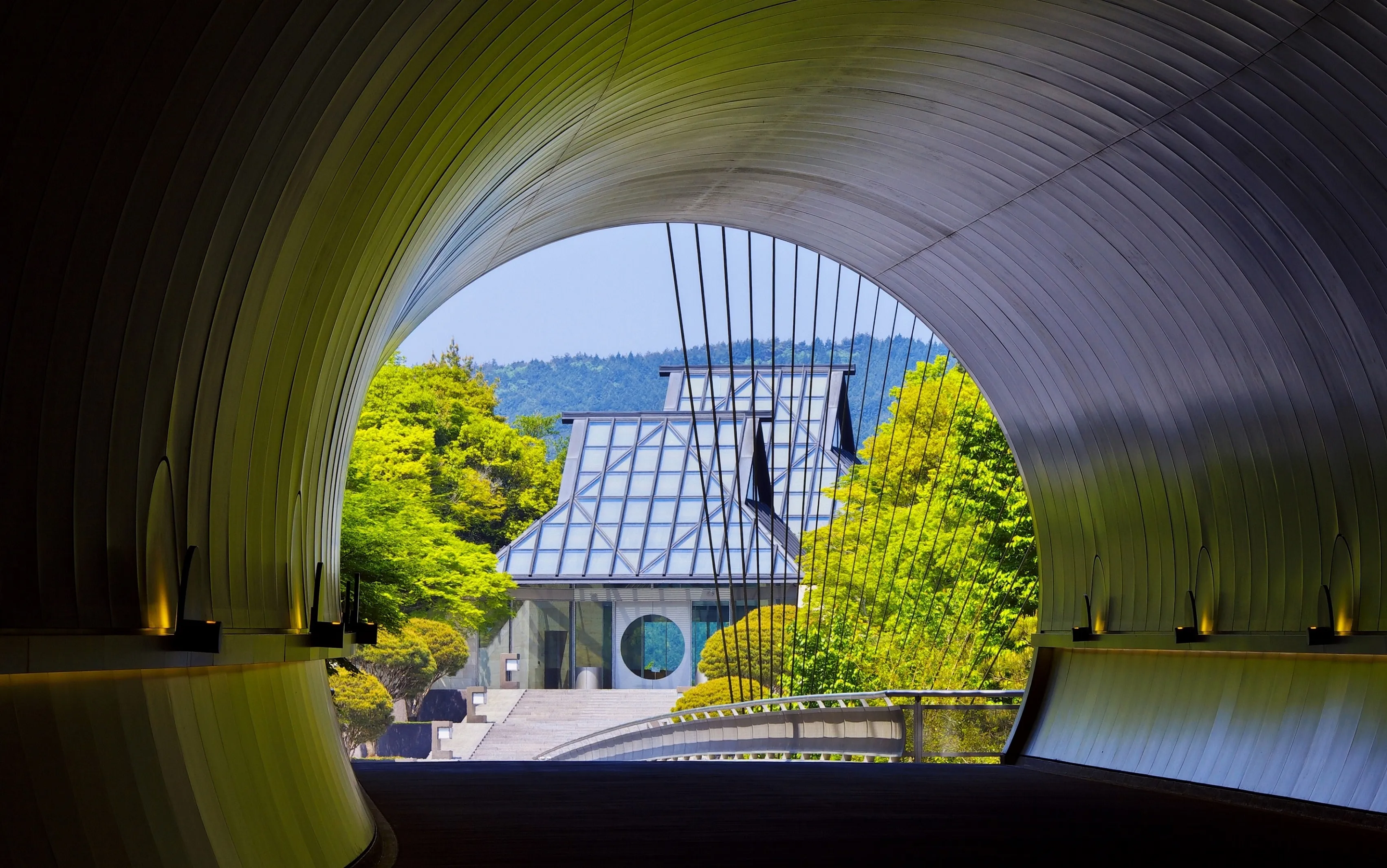 枝垂れ桜のプロムナードを通り、銀色に輝くトンネルをくぐると、吊り橋の向こうに美術館棟が現れる設計は、中国詩に描かれた桃の花に導かれ洞窟を抜けた先に現れる楽園「桃源郷」をテーマにしています。