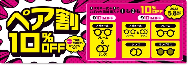 キャンペーン内容:ペア割 メガネ一式にプラスしてメガネ・サングラス同時購入で10%OFF。