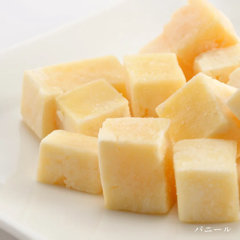 パニールとは、インドで一般的に使われるカッテージ風チーズを指します。ふわっとした豆腐のような、モッツァレラチーズのような弾力があり、噛みしめるとチーズの旨みが口いっぱいに広がります。