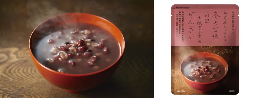同時に、丹波大納言小豆に雑穀をあわせ、素材の味わいを生かした上品な甘さの冬の甘味「丹波大納言小豆のぜんざい」も発売いたします。レトルトパウチに閉じ込めた冬の味覚を、お家でカンタンにお楽しみいただけます。