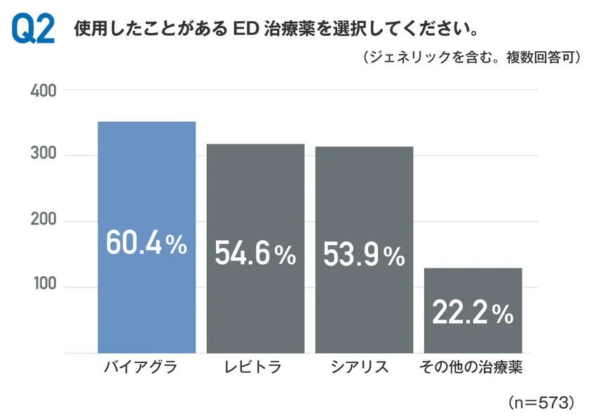 使用経験のあるED治療薬を聞いたところ、「バイアグラ(60.4%)」が最も多く、「レビトラ※1(54.6%)」「シアリス※2(53.9%)」が続きました。