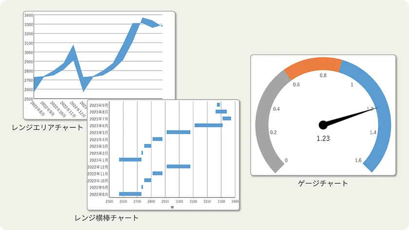 Chartコントロールに、新グラフ形式「レンジ」「ゲージ」を追加しました。また、グラフ要素のインタラクティブ性を向上させる「系統・凡例のアクション対応」や、日付型軸の表示形式を設定する「日付モード」プロパティなどの機能も追加しています。