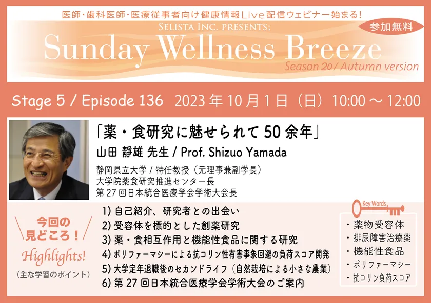 《医師・歯科医師・薬剤師向け》 無料オンラインセミナー10/1(日)朝10時開催 『薬・食研究に魅せられて50余年』 講師:山田 靜雄 先生(静岡県立大学/特任教授、元理事兼副学長)