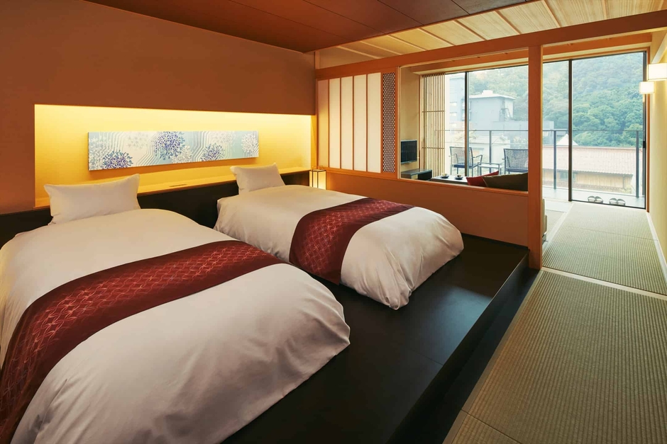「九谷焼」「山中塗」「加賀水引」「加賀友禅」といった石川・金沢エリアが誇る代表的な4つの伝統工芸を随所に配した客室です。九谷焼の茶器でティータイムを楽しみ、山中漆器の壁掛けに加賀の文化を感じるひととき。障子にあしらった加賀水引が上品な輝きを放ち、ベッドルームでは加賀友禅のパネルがおやすみ前の時間を優雅に彩ります。