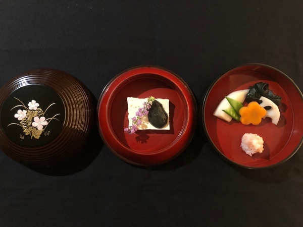 4 会席料理「固豆腐、金時草、甘海老」を使ったご挨拶の品