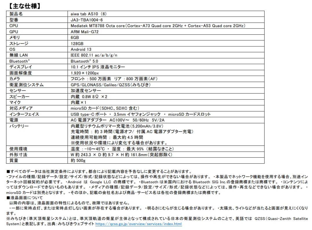 【製品情報URL :https://aiwa.net/products/aiwa-tab-as10-6/】