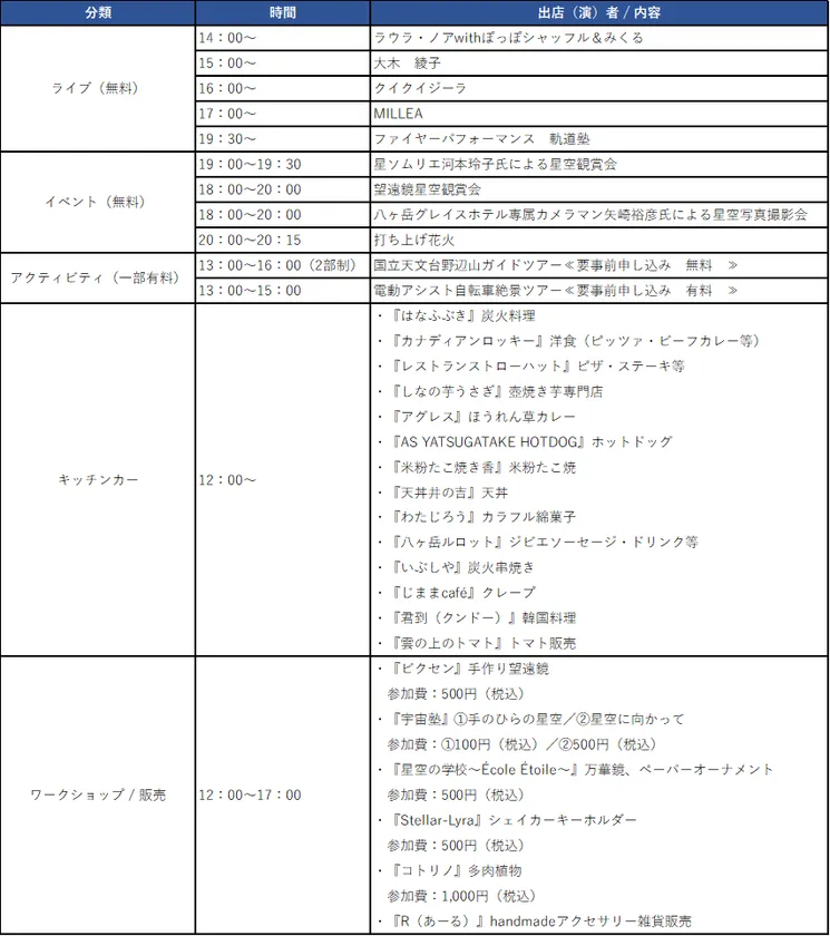 星空観賞=夜だけのイベントだと思われる方も多いと思いますが、自然豊かな南牧村を体験していただくために、自然アクティビティツアーや、たくさんのワークショップ&キッチンカーが出店し、日中から楽しめるイベントをご用意しています。