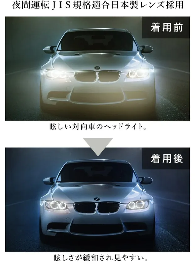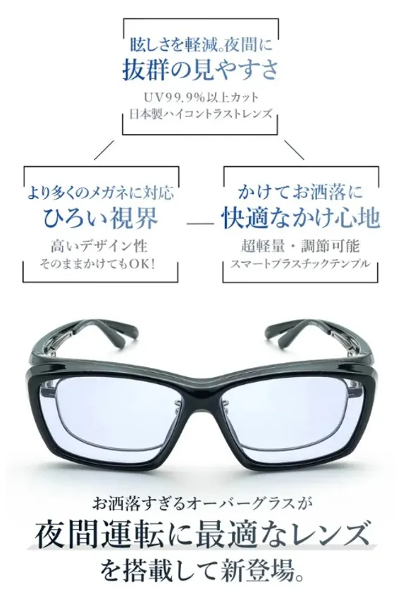 本商品は、メガネの上から簡単にお洒落にかけることができるフレームをベースに、メガネの産地・鯖江のレンズメーカーの協力のもと、夜間運転のためのJIS規格に適合するレンズを採用した、メガネ使用者の方々により快適に運転していただくために開発された商品です。