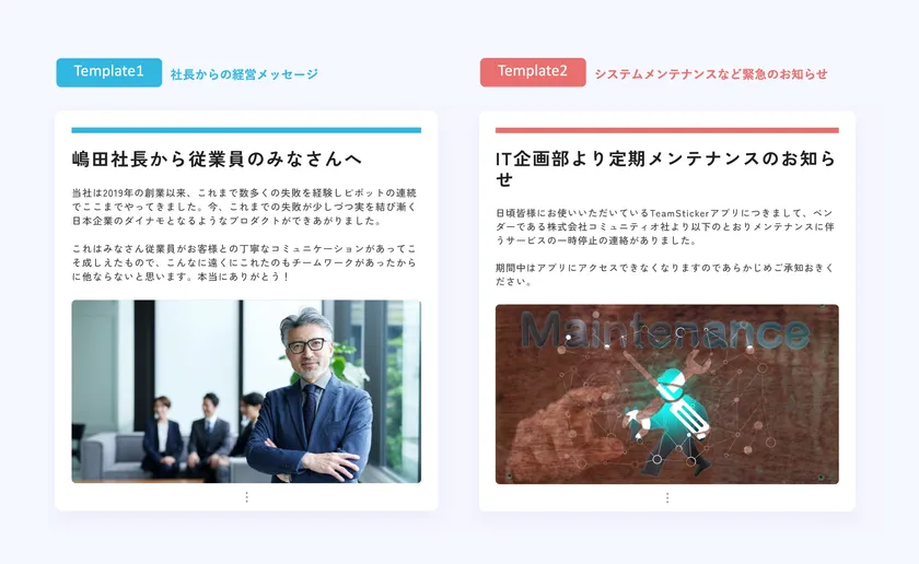 全従業員にメッセージを伝えるには、一斉配信の機能に加えて、「伝わるメッセージ」も重要です。「伝わる」にこだわったテンプレートを搭載。担当者の負担をかけることなく、写真や絵を交えた伝わりやすいメッセージが送信できます。