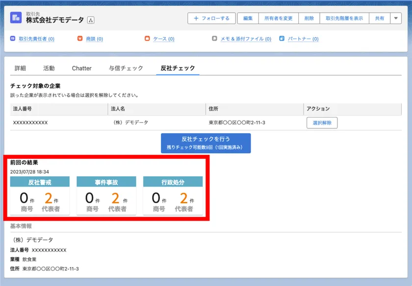 「反社チェックを行う」ボタンのクリックで、「反社警戒」、「事件事故」、「行政処分」件数を把握することができます。