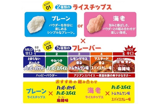 定番の味わいは甘じょっぱい味わいでとまらないおいしさの「ハッピーパウダー」と、やみつきになる「ハッピースパイス」の2種類。異国体験ができるアジアンスパイスは、お米と相性が良いアジアのエスニック料理の味わいを再現しています。「レモングラス香るトムヤムクン味」「マスタード香るスパイスカレー味」「花椒香る麻辣(マーラー)味」の3種類で、本場でも使用しているスパイスやハーブを使用し、爽やかな辛さに仕上げました。
