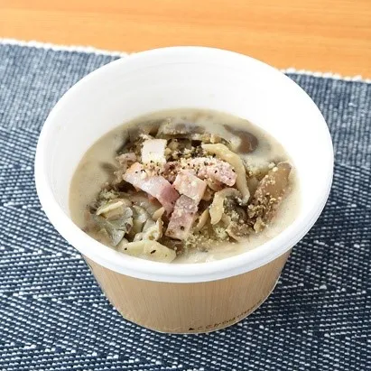 【内容】ふわっと広がるきのこの香りが楽しめる、とろっと濃厚な味わいのクリームスープです。ベーコンやトリュフオイルを使用することで、スープのコクや香りを引き立てています。プチプチ食感が癖になる押麦やぶなしめじ、まいたけ、マッシュルームを入れ、食べ応えある一品に仕上げました。